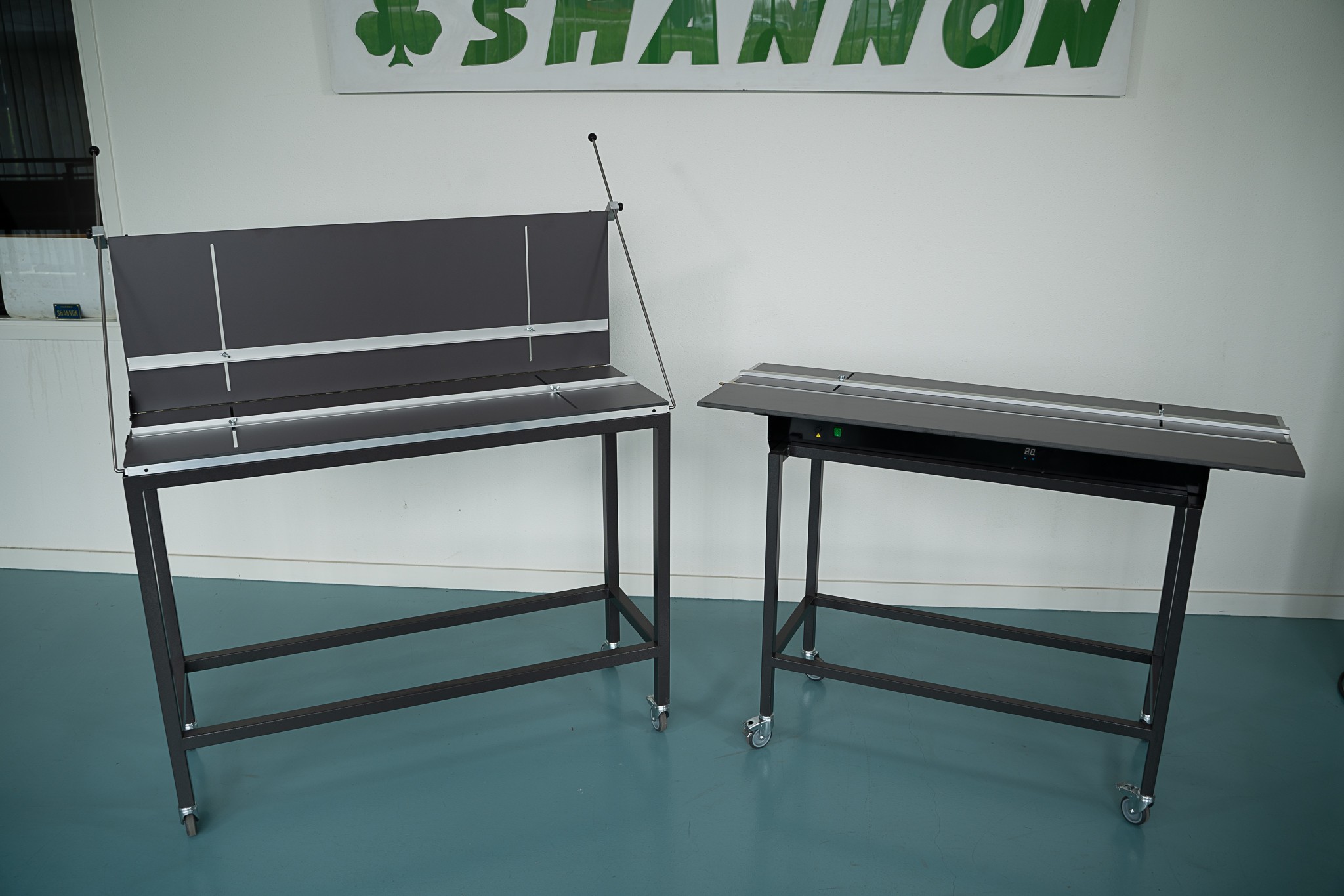 The filament temperature can be adjusted electronically very precisely by means of a control unit. The durable, heat and scratch resistant working plateau is equipped with a parallel back stop with 2 rulers or a side stop and a single ruler.