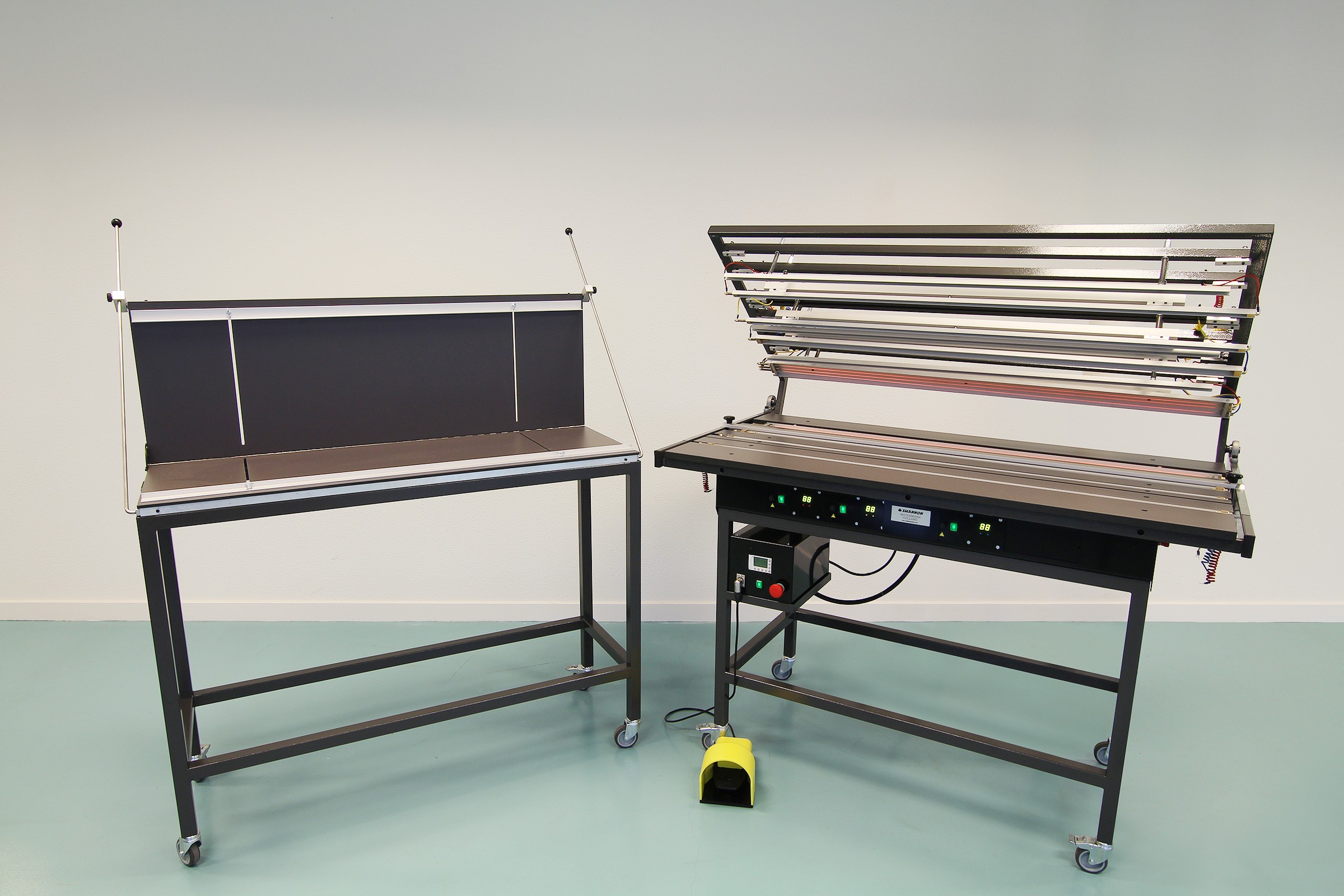 The pneumatic upper frame has adjustable pressure bars that hold the plates in place and prevent them from deforming (banana effect). The upper frame is controlled by a foot pedal, a timer switch and an emergency stop. The durable and heat-resistant work surface consists of several adjustable panels and has a parallel stop with millimetre and inch indication.