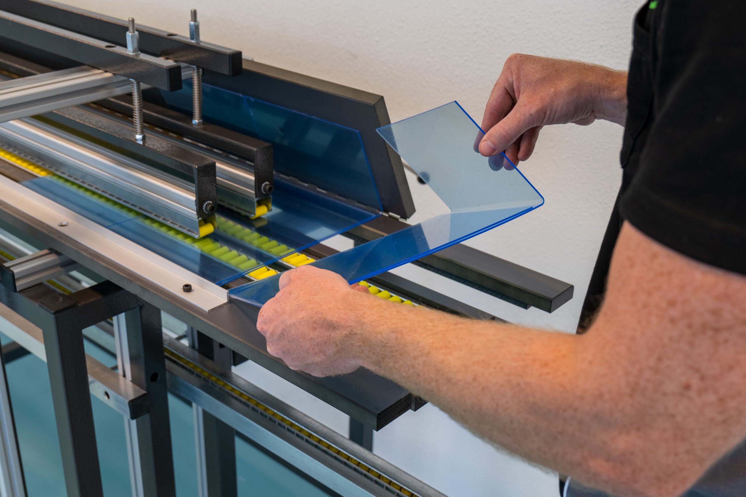 Està equipada amb fins a 4 controladors de temperatura per a 4 línies d'escalfament i 4 pistes de rodets de subjecció. És una màquina dobladora de làmines acríliques semiautomàtica altament productiva i resistent amb escalfament inferior.